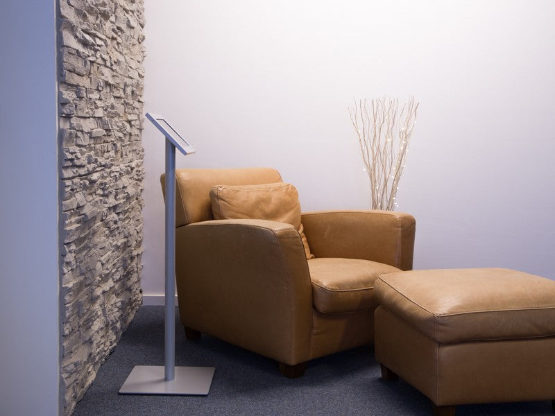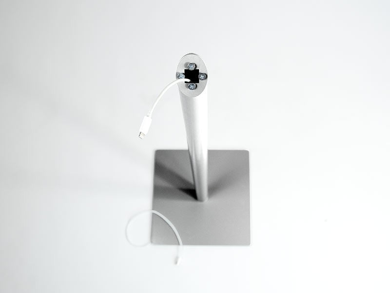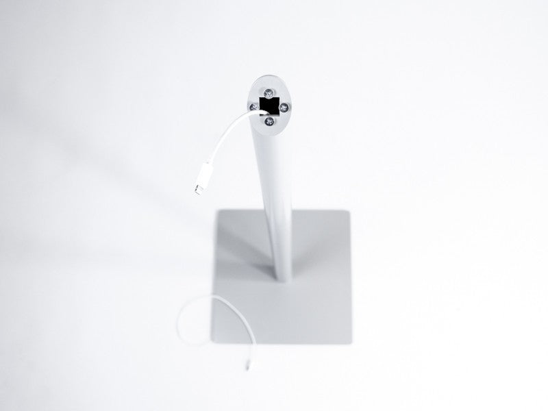 Der praktische Tablet Bodenständer ist in den Farben weiß, silber, schwarz und Edelstahl gebürstet lieferbar. Der Tablet Standfuß ist sehr robust und standfest. Die extra breite Bodenplatte bietet dem Tablet soliden Halt mitten im Raum. Die Standardhöhe von 100 cm ist für die stehende Nutzung optimiert. Das Stromkabel wird unsichtbar durch den Tabletstandfuß, direkt zu Ihrem Tablet geführt.