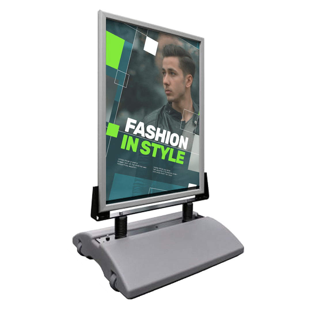 Der Kundenstopper Windmaster NT im DIN A0 Format ist der ideale Werbeaufsteller für Ihren Shop. Dieser Outdoor-Plakatständer trotzt beinahe jedem Wetterverhältnis und ist mit seinem wasserbefüllbaren Standfuß für den Langzeiteinsatz ausgelegt. Die elastische Lagerung auf speziell entwickelten Stahlfedern sorgt für eine besonders hohe Standfestigkeit bis Windstärke 10. Die im Sockel integrierten Laufrollen ermöglichen außerdem die mühelose Positionierung in Fußgängerzonen, Laufwegen oder direkt vor Ihrem Shop. Der hochwertig verarbeitete Kundenstopper Windmaster NT ist mit einer beschichteten Stahlblechrückwand und einem doppelseitigen, silberfarbig eloxierten Klemmrahmen mit Gehrungsecken ausgestattet. Für die Wetterfestigkeit ist durch eine übergroße, UV stabilisierte und entspiegelte Antireflex-Schutzfolie und eine Plakat-Klemmschiene gesorgt.