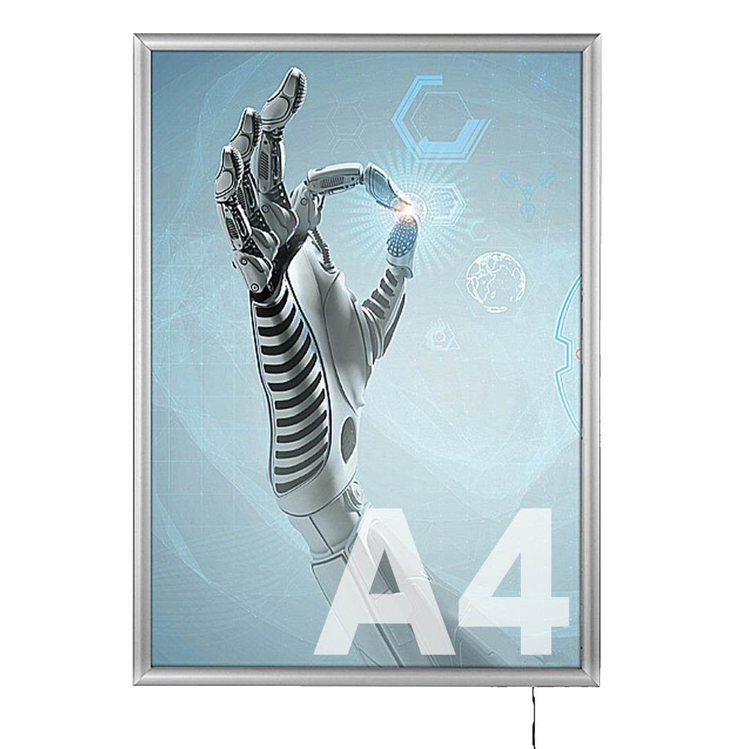 LED Frame DIN A4 - Ein einseitiger LED Leuchtrahmen mit silber eloxiertem 25 mm Snap-Profil. Der Rahmen hat eine Tiefe von nur 18 mm und eine stabile Rückplatte. Ausgestattet mit einer Antireflex Plakatschutzfolie. Die Lieferung erfolgt inkl. 2 Wandaufhängungen. Kann vertikal und horizontal montiert werden. Inkl. einem 3,5m Stromkabel samt Netzteil.