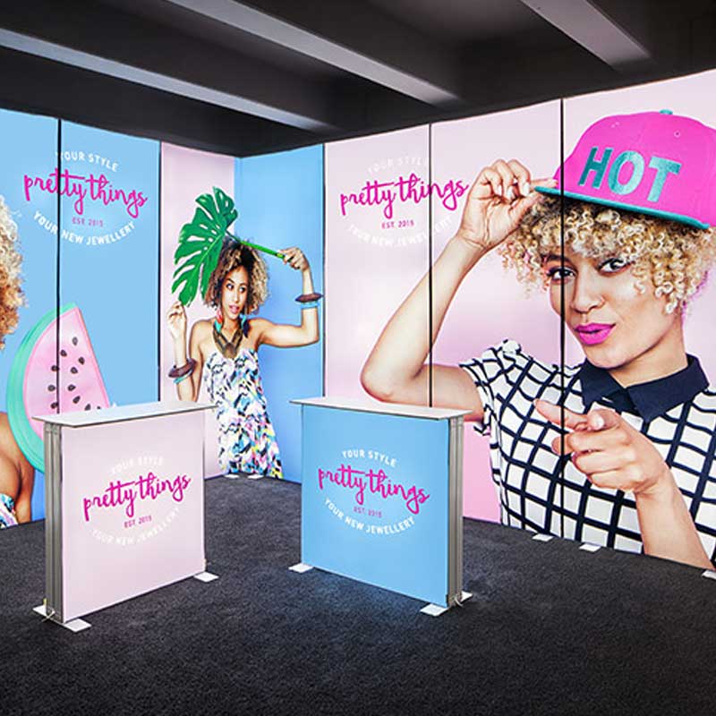 Wir setzen die Leuchtwand in unserem Showroom ein und nehmen sie auch manchmal mit zur Messe. Der Aufbau ist easy. Rahmen zusammenstecken, Textildruck montieren, fertig!