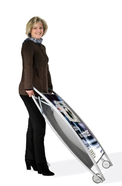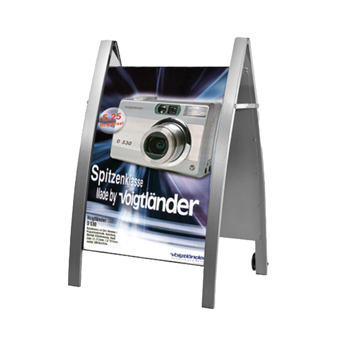 Der wetterfeste und hochwertige Kundenstopper A1 "Design" aus pulverbeschichtetem Stahl macht durch seine leicht gewölbte Form einen sehr edlen Eindruck. Die integrierten Rollen sorgen für Mobilität und ermöglichen eine mühelose Platzierung des Plakatständers. Die UV-stabilisierten und entspiegelten Schutzfolien werden mit Magnetstreifen am Rückblech montiert und dienen einem komfortablen Plakatwechsel.