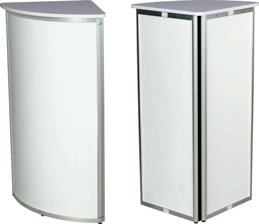 Die faltbare Ecktheke "AluFold" kann als freistehender Promotion- und Messe-Podest eingesetzt werden, oder auch in Kombination mit unserer "Alufold Rechteck-Theke" zu einem Ecktresen aufgebaut werden. Natürlich können Sie auch mehrere Ecktheken und Rechtecktheken kombinieren und Ihre ganz individuelle Tresen-Form umsetzen. Die Thekenflächen bedrucken wir auf Wunsch individuell mit Ihrem Motiv oder färben die Flächen nach Ihren Wünschen ein. Optional können wir die Theken auch hinterleuchten. Hierzu ist auf Anfrage ein Beleuchtungs-Set erhältlich.Unsere Fachberater informieren Sie gerne über die Möglichkeiten und erstellen Ihnen ein unverbindliches Angebot.