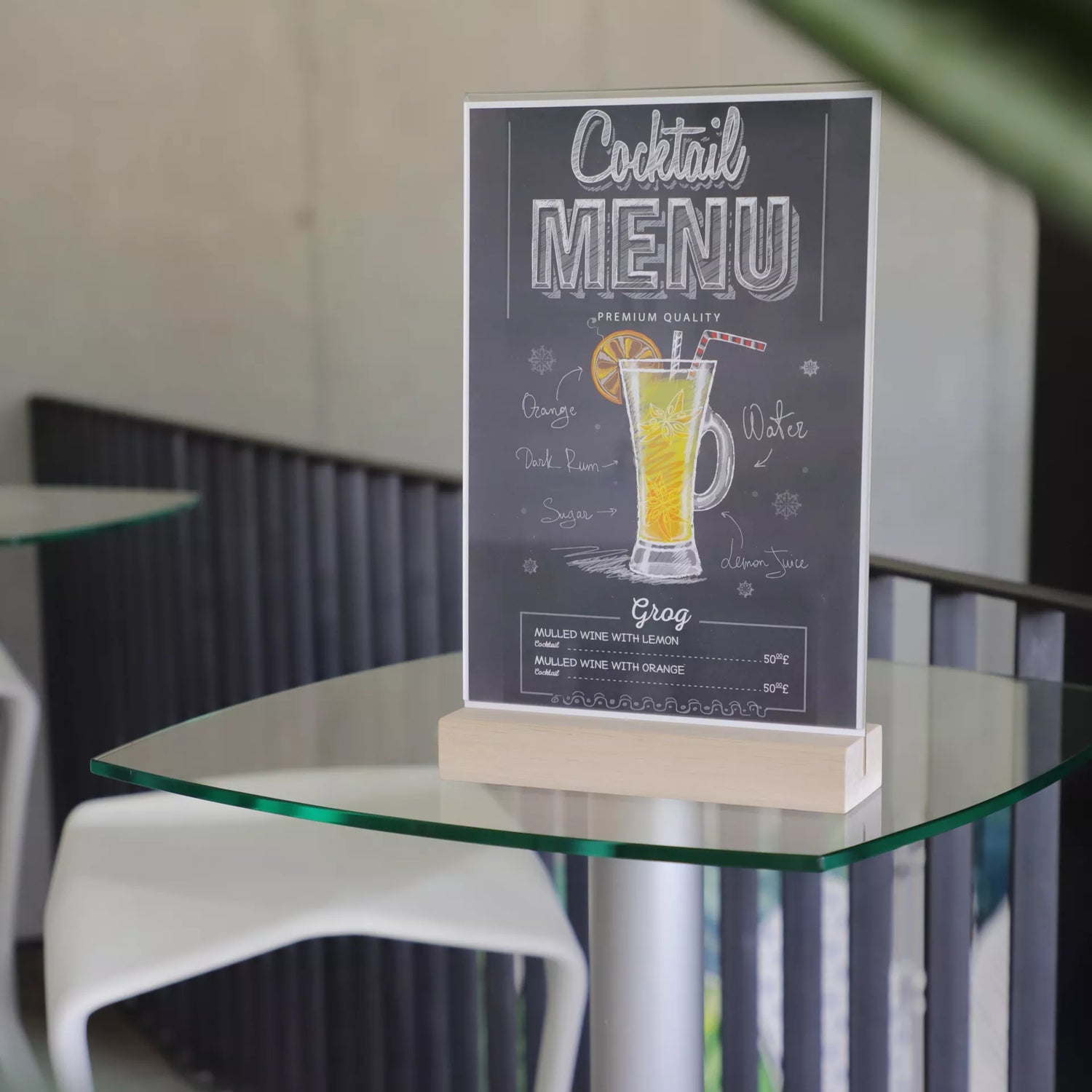 Unser Tischdisplay aus Holz (FSC) ist ein doppelseitiger Tischaufsteller, der durch seinen eleganten Boden und seiner Acryltasche mit ausgezeichneter Widerstandsfähigkeit besticht.