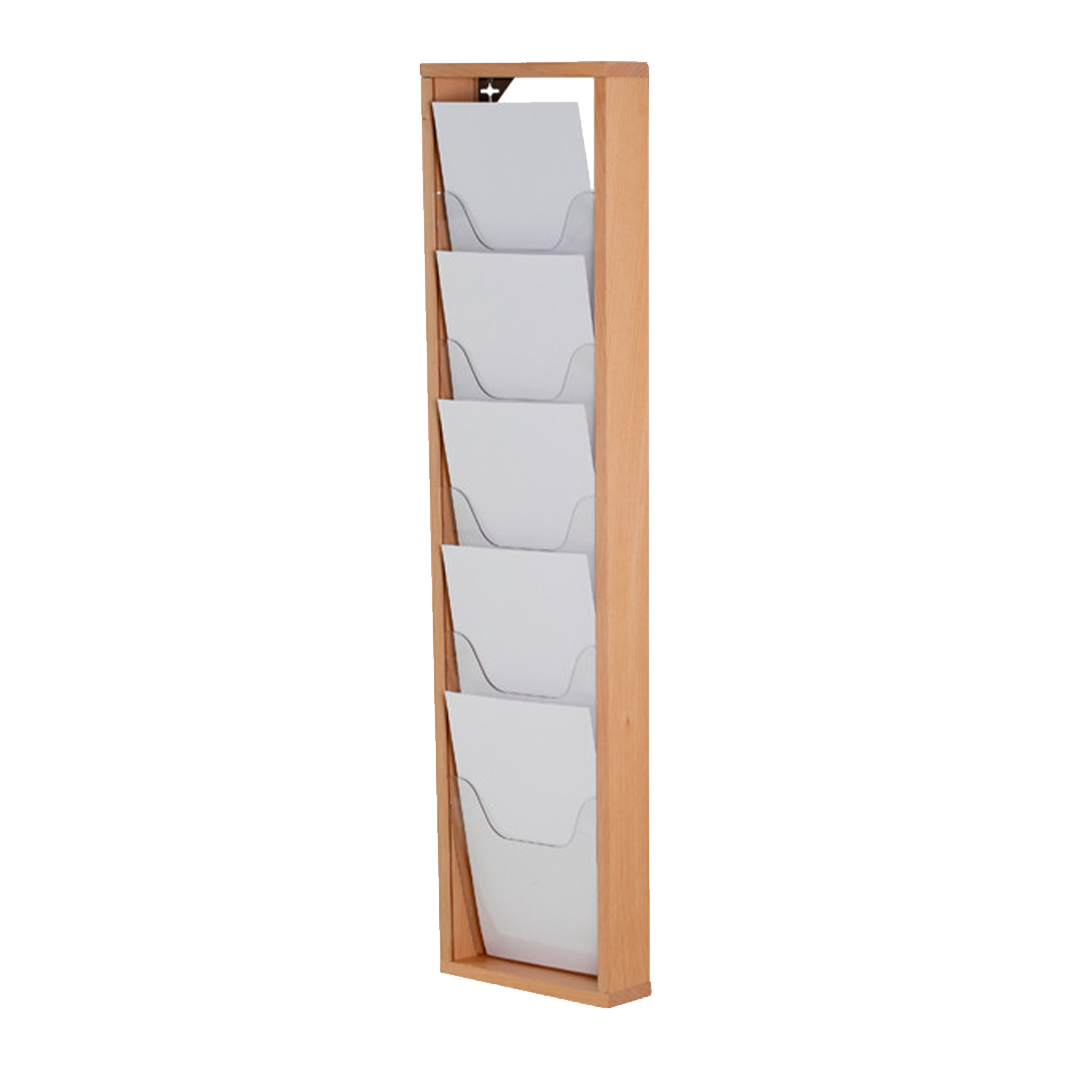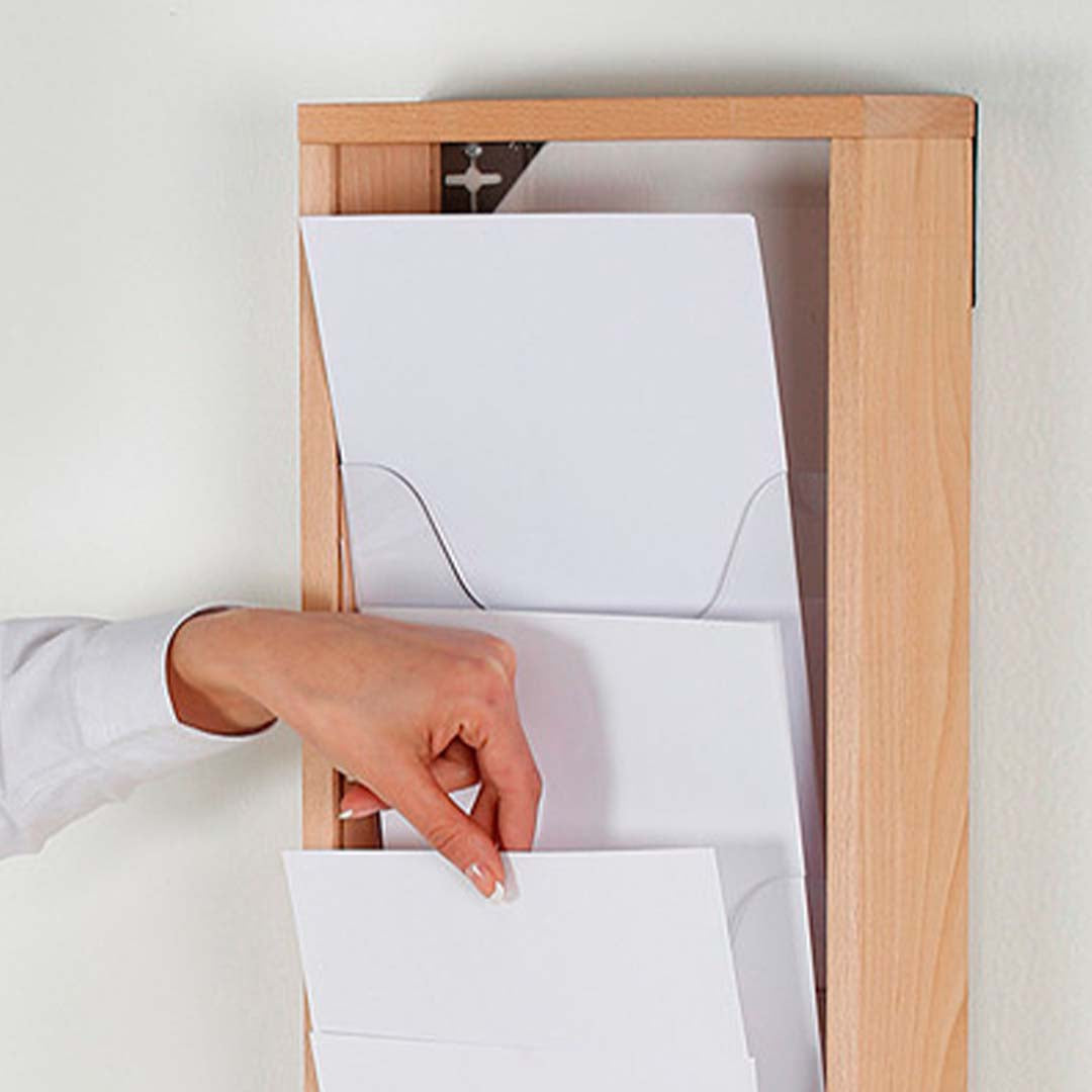 Wandprospekthalter Woody - Eleganter Broschürenhalter aus Buchenholz zur Wandmontage. Holzrahmen mit 5 Acrylhalter für A4 Prospekte.
