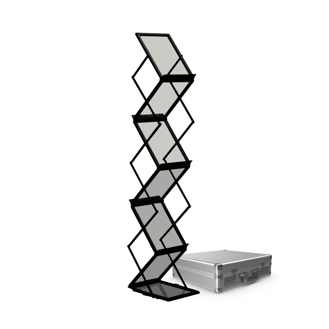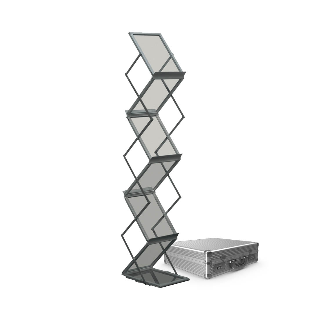Der klappbare Prospektständer "Show-it" verfügt über ein besonders kompaktes Transportvolumen und ist somit mühelos im PKW oder Zug transportierbar. Im Aufbau ist er einfach nach oben aufklappbar und somit innerhalb von Sekunden einsatzbereit. Der Prospektständer "Show It" ist mit 5 Broschürenfächern aus Acryl im DIN A4 Format ausgestattet, die beidseitig erreichbar sind. Auf Wunsch gestalten wir Ihren Prospektständer optional auch individuell mit Ihrem Logo. Nehmen Sie einfach Kontakt zu uns auf. Wir beraten Sie gerne.