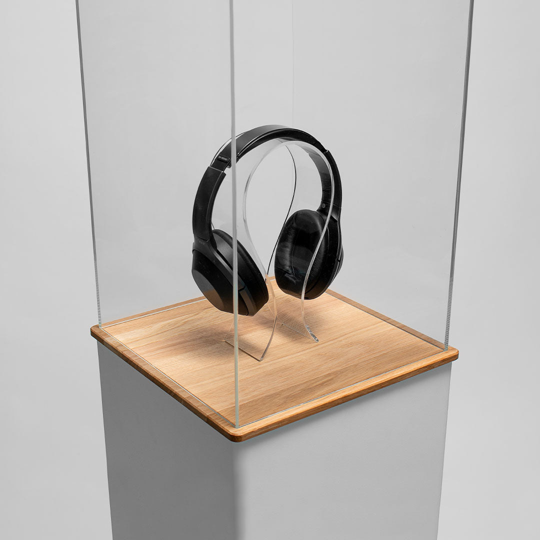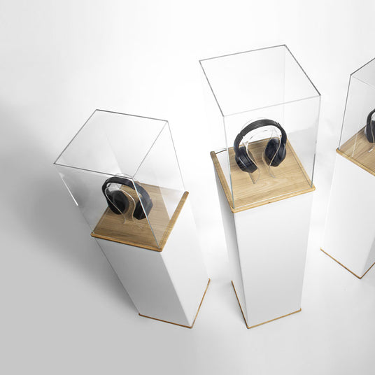 Der FLUX BLOX Presenter lässt sich optional zur hochwertigen Vitrine erweitern. Hierfür wird ein maßgefertigter Plexiglas-Würfel einfach auf die Podestplatte gesteckt, sodass Ihre Produkte, Exponate oder Sammlerstücke stilvoll und sicher präsentiert werden können.