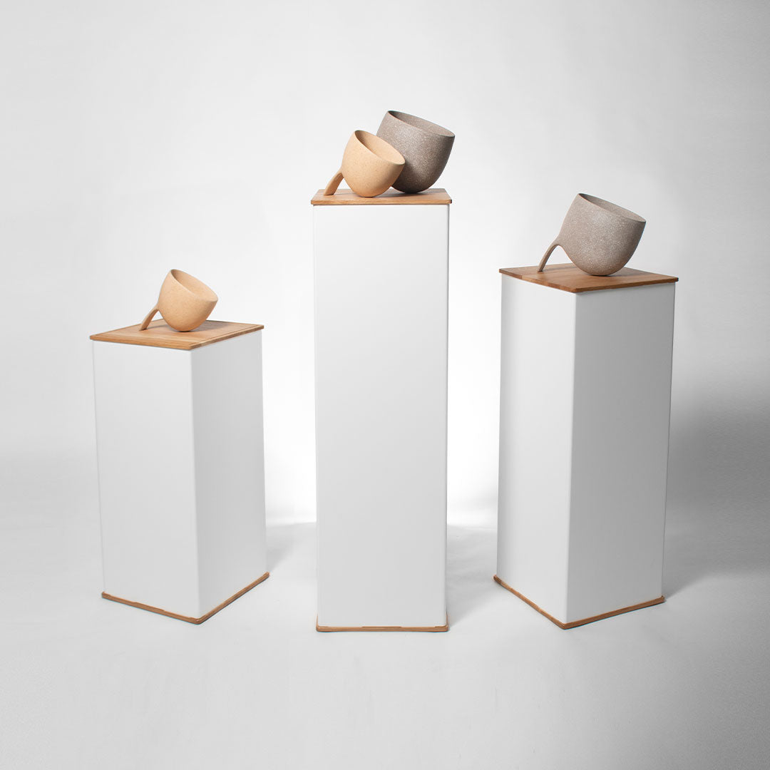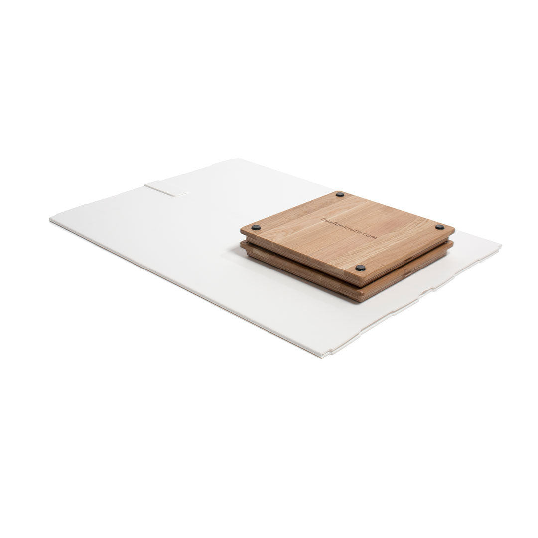 Der FLUX BLOX Presenter besteht aus nachhaltigem Polypropylen, das besonders robust, pflegeleicht und umweltfreundlich ist. Die Boden- und Tischplatte sind aus massiver Eiche gefertigt, was dem Podest eine edle Optik und hohe Stabilität verleiht.
