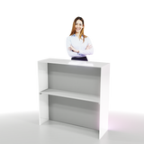 Der LED Counter mit abschließbaren Schiebetüren ist ideal als beleuchtete Messetheke, Promotiontheke und Empfangstheke auf Events einsetzbar.