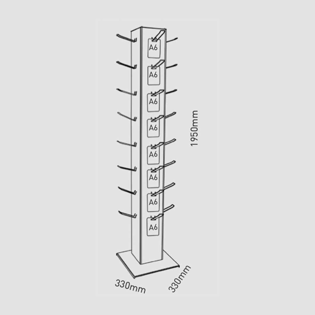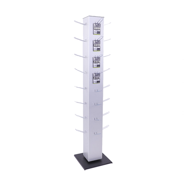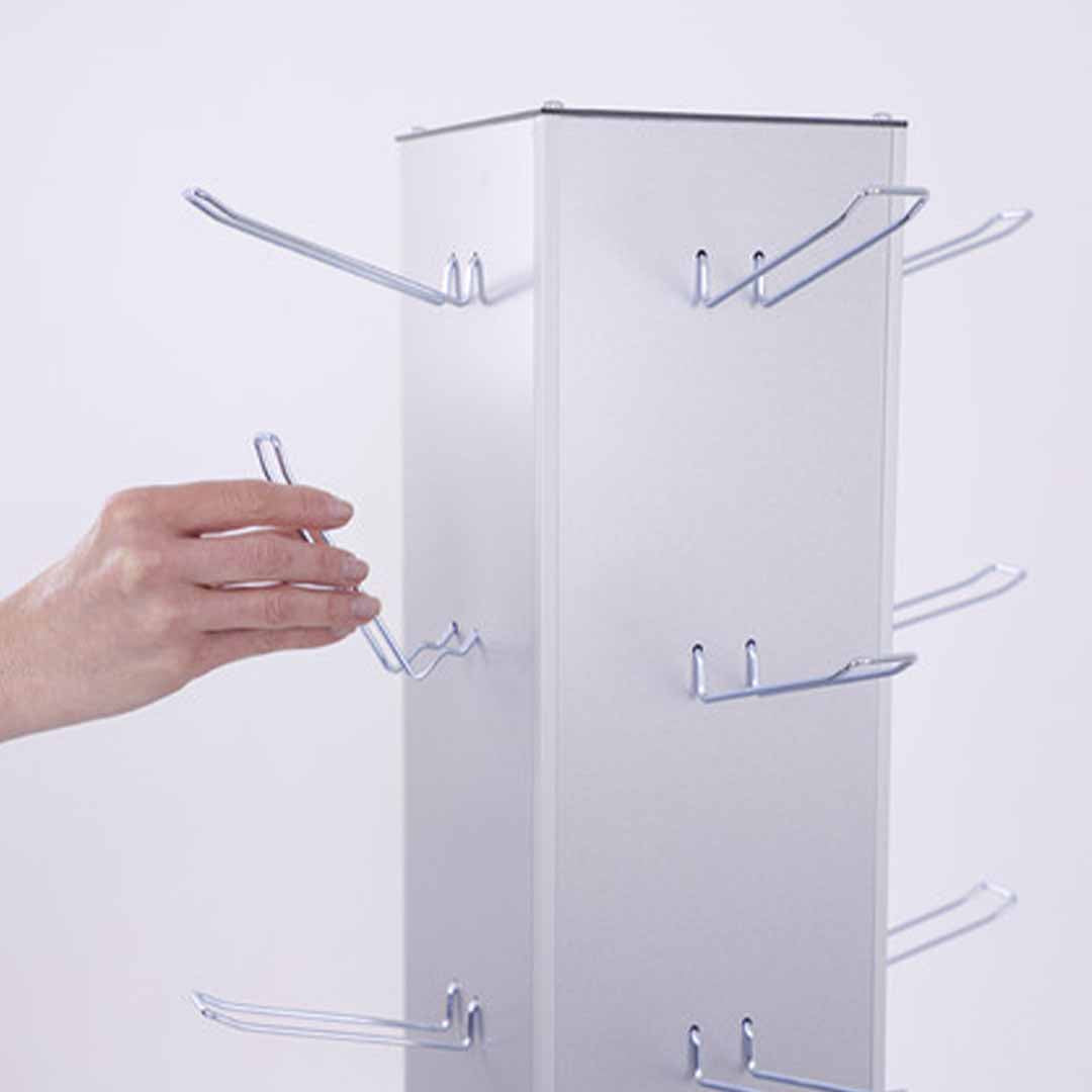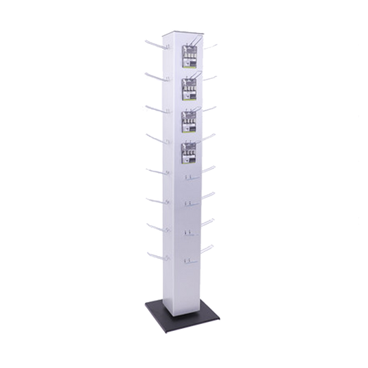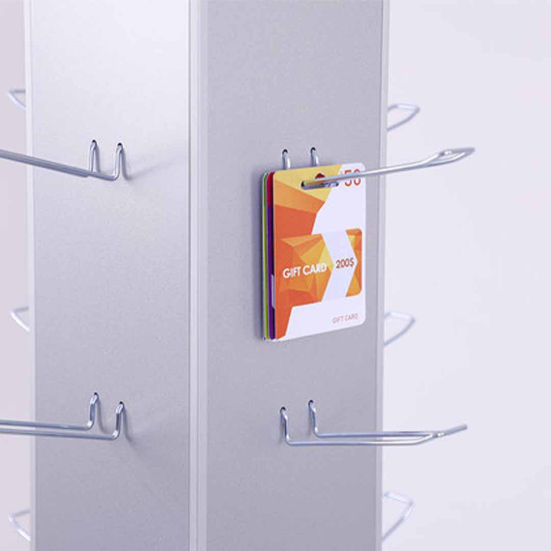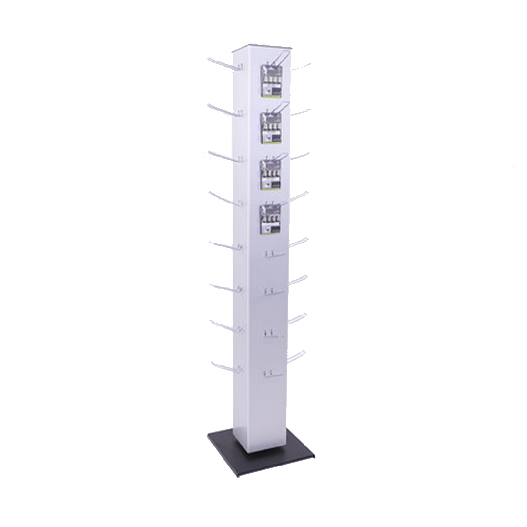 Der Mister Blister Präsentationsständer ist ein drehbarer Tower mit Blisterhaken für Euro-Loch Packungen oder Wertkarten und bietet Platz für acht Haken je Seite. Drehbar und kompakt präsentiert er am POS Verkaufspackungen, Gutscheine oder Prepaid-Karten.